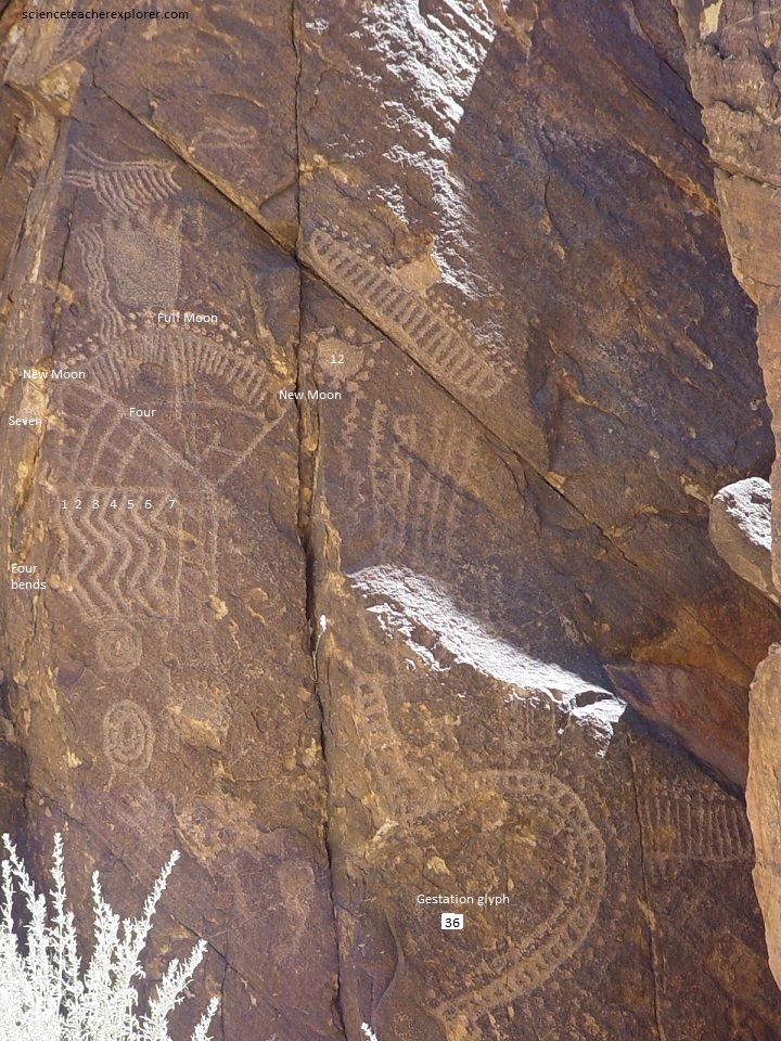 Also pictured above, the fan below the owl has 29-day lines. The fan is an actual picture of the moon’s traverse across the sky from new moon in the west to full moon overhead, to last crescent moon in the east. The section below the fan has a 6-comb (6 months) and 4-ladder (4 seasons) and 3-space (3 month quarter).