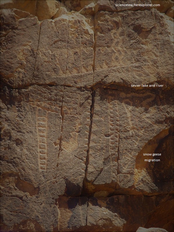 Pictured above, the lower right section of the above panel, pictures a dramatic life cycle miracle at the Gap. Four geese are pictured flying in their northward migratory flight. [Annually 30,000 Snow Geese fly north over the Gap to the Delta marsh lakes in Utah during the last two weeks of February]. On the panel, these four geese are pictured flying up toward a serpent trail. Locals recognize this snake above the geese as the Sevier River, bending back on its course to Sevier Lake, which is wide at the top and narrow on the south end. The Circle and bird-track trail extending down from the serpent trail head matches Wah Wah Valley due south of Sevier Lake to Sulphur Springs at Lund in the Escalante Desert where trails fork into 4 directions like birds toes.