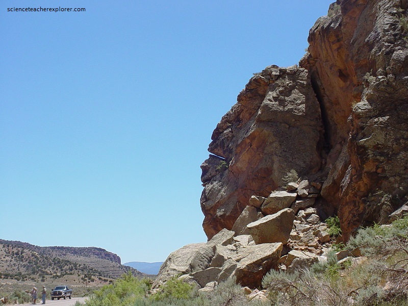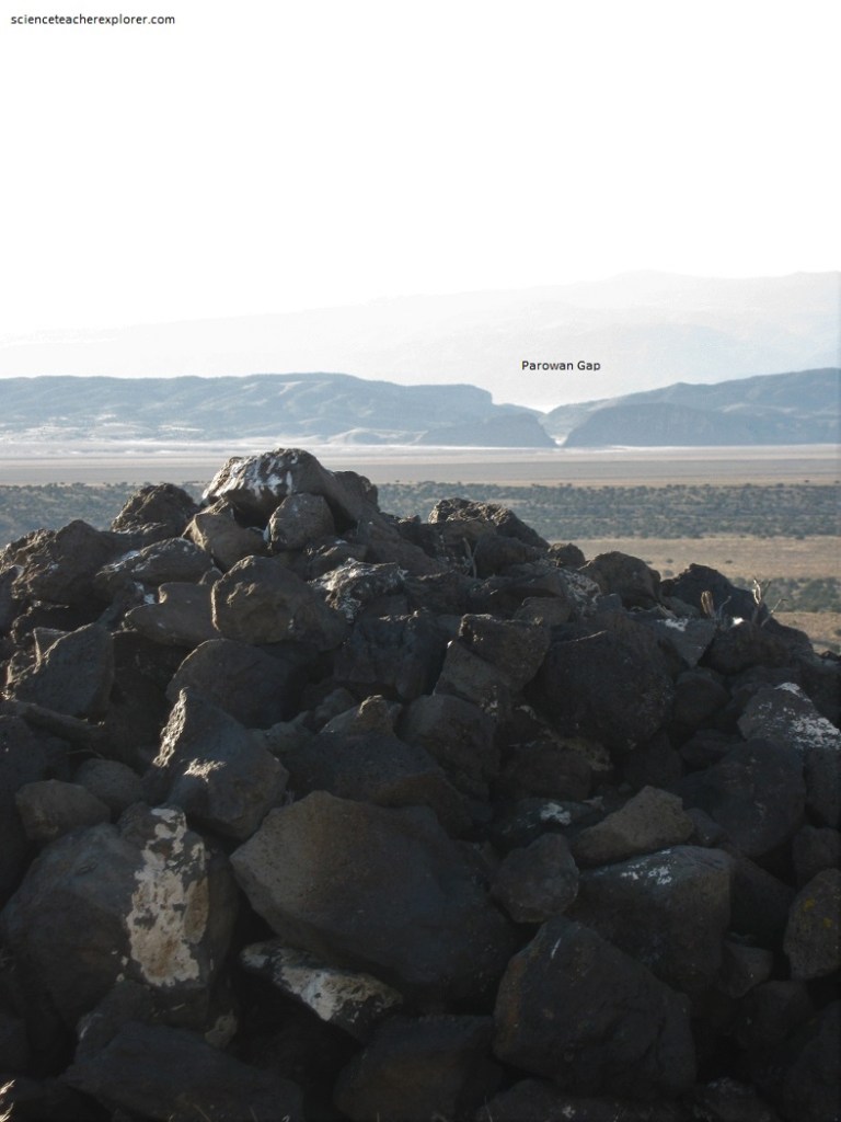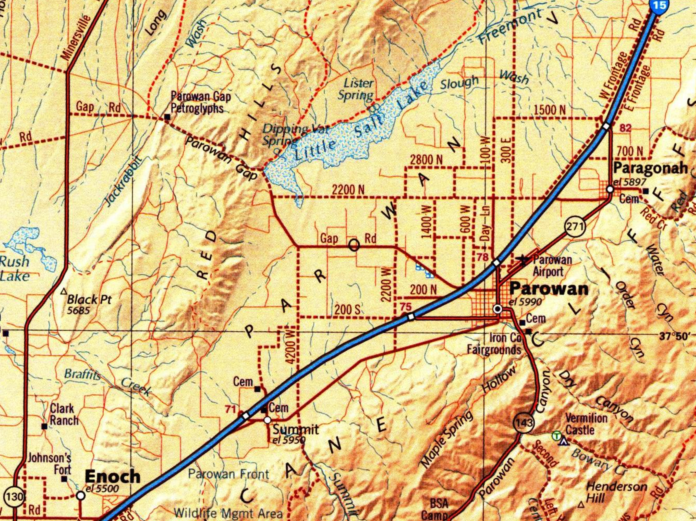 The Parowan Gap is located in southwestern Utah on I-15. While on I-15 going southwest, take Exit 78 (Parowan) and turn toward the town of Parowan into downtown Parowan. While heading south on Main Street, turn west (right) onto 400 North. Drive under the interstate, and continue west for about 17 km until you see a public parking lot, before you drive through the Parowan Gap. Park and walk through the canyon on the road, west of the parking lot (imaged below).