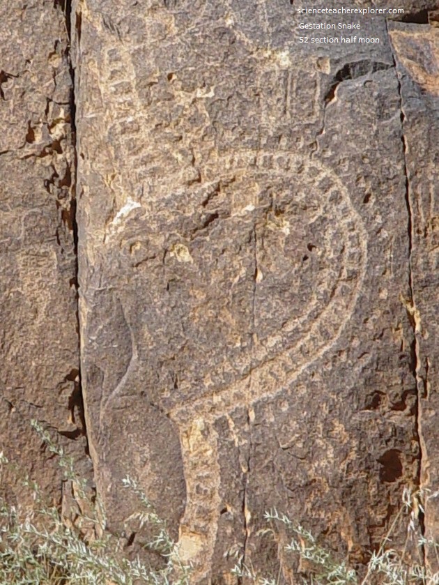Pictured above, a large U-shaped (pregnant) serpent at the lower right has 52 count body sections on it’s body which relates to the 260-day fertility gestation cycle (9 lunar months).