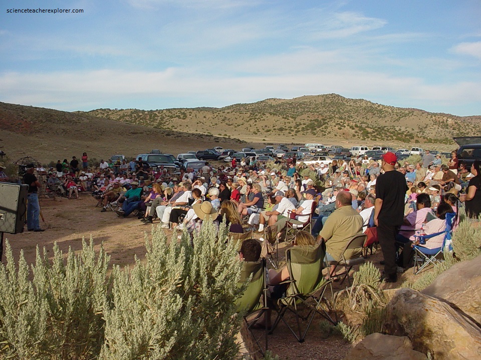 The petroglyphs, pounded into Navajo Sandstone at the narrows, are thought to be the creations of multiple cultural groups over a lengthy period of time, (some glyphs are possibly almost 5,000 years old). To the modern-day Paiute and Hopi Tribes, this is an important historical, cultural, and spiritual site. Therefore, I had the Garrison, Utah Paiute Chief and Nowell L. Morris give a public speech and showing on the Summer Solstice of 2007, (Pictured below on June 21st). I also organized a star party, (20 telescopes), after viewing the sun-down event on the eastern side of the narrows.