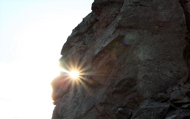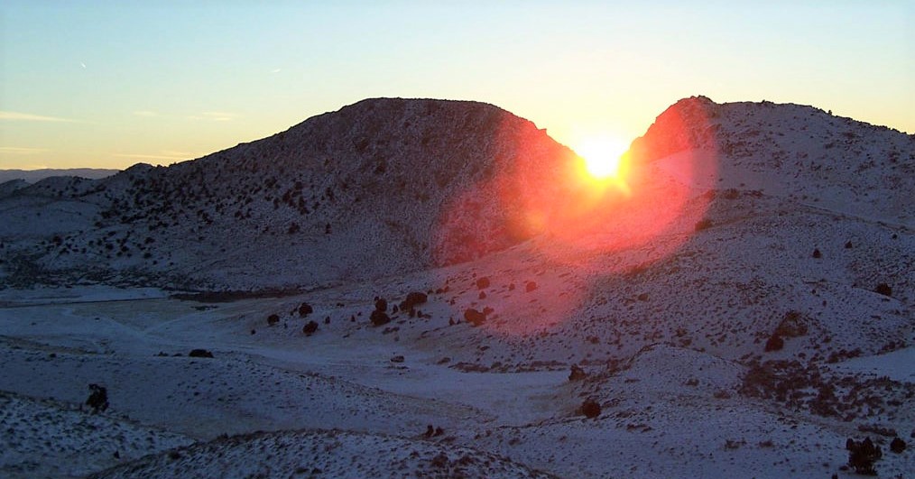 On the first day of the Fremont Winter, (November 5th), the sun rises at 7:49 A.M. in the cross quarter notch and proceeds to pass through Tobats mouth at 9:00 A.M. (pictured below). (It should be noted that at the Summer Solstice sunset cairn places the course of the sun over Tobats’ head and the actual set is in his face).