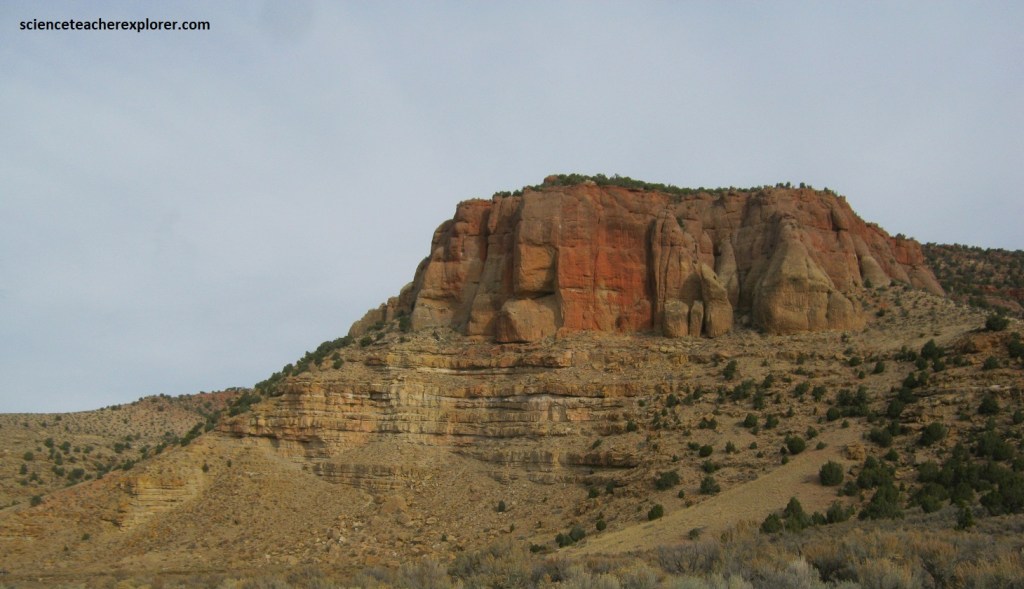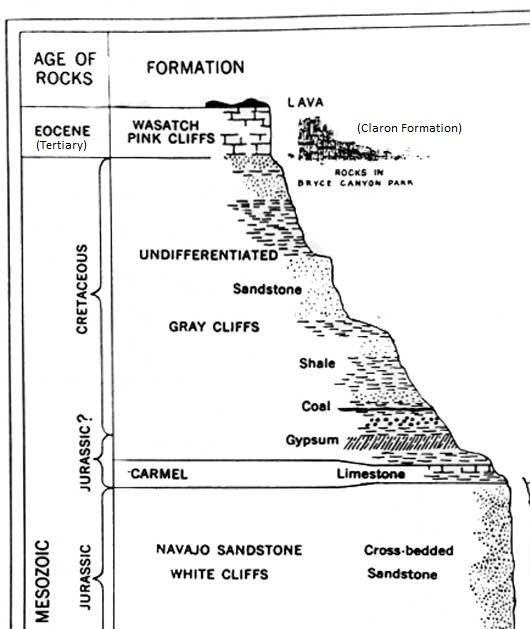 These rock formations include the Jurassic-age Navajo Sandstone and Carmel Formation (on the west side of the Gap), the Late Cretaceous-age Formations, and the early Tertiary-age (Eocene) pink member of the Claron Formation (imaged below).