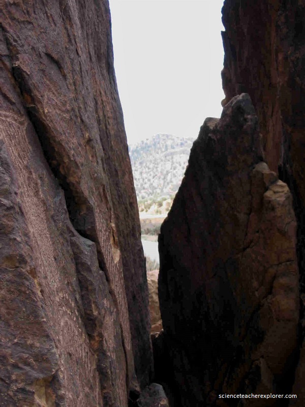 As viewed from inside the Gap Narrows, there is the profile of a stone face, (pictured below). Nowell Morris explained to me that this is the Paiute God symbol called “Tobats”. Pictured below in profile, Tobats is the Stone Face that lives in the Gap. In order to see Tobats, we entered the Narrows and then positioned ourselves 1/3 of the way through the Narrows from the east end. From that point, Mr. Morris had me look up on the south side of a large protruding rock, with me facing east. There was a deep crack in the rock above the larger cave. This was Tobat’s mouth. He also had lips, jaw, chin, nose and eye (pictured below).