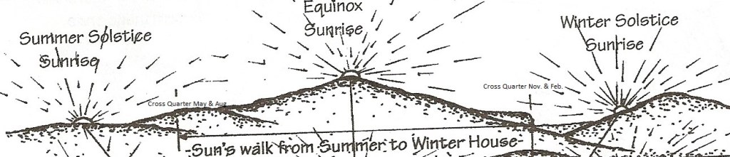 To the Pre-Columbian peoples, the sun was a basketball sized sphere of fire. It flew just over head and always out of reach. And while the sun was one of the most powerful of cosmic entities, he was not beyond being influenced and controlled. The sun, the moon and the earth were in constant interaction where their personalities could be in conflict and competition. Therefore it was important that the ancients watch over these entities. Pictured below, Nowell L. Morris provided a drawing of the eastern horizon as seen from the Zipper Glyph. He had designated the traverse of the sunrises between the cross quarters. This is the sun’s walk between his two houses. Where the day count leaves and enters the two houses, become the two major points of division on the glyph.