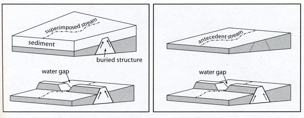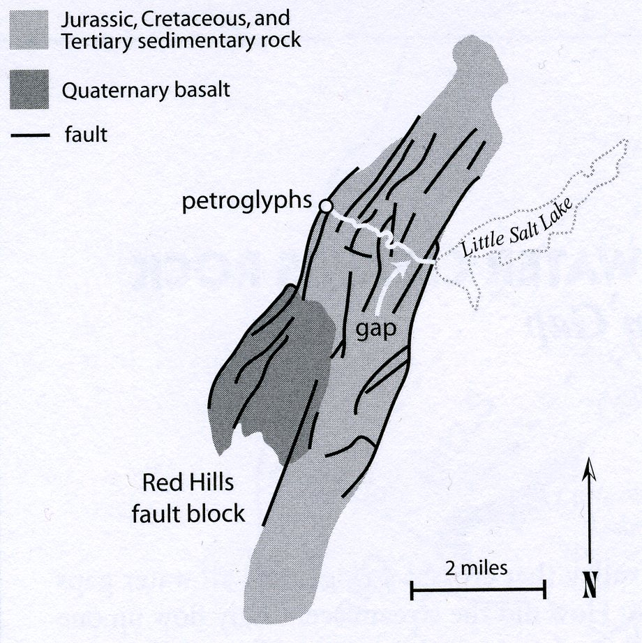 Approximately 15 million years ago, a long slender section of sedimentary rock sheared from the earth’s crust along parallel fault lines (imaged below). This up-thrown block, later named the Red Hills, began to move its way above the surrounding valley floor. At the same time the block was rising, a stream was cutting a path perpendicularly across the ridge. For millions of years the uplifting of the ridge and the down-cutting of the stream remained in equilibrium.