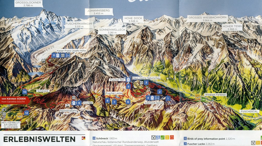 Pictured above and below, the Kaiser-Franz-Josefs-Hohe (2369 m), is a lookout point with a direct view of the Grossglockner and the Pasterze, (the longest glacier in the Eastern Alps).