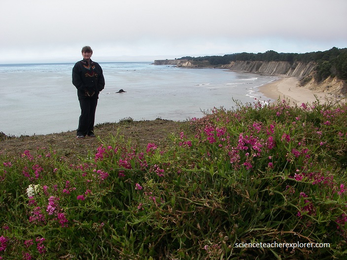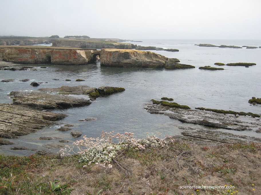refraction will ultimately do to the Point Arena headland. The rocks exposed along the edges of the cliffs are also weathering at different rates, giving Becky and I, a first-hand view of this differential weathering. There were also rock falls and landslide features evident. All these are key
