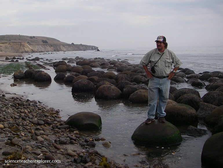 A fantastic extra feature of the nearby sedimentary rocks further south is the dramatic concretions found at Bowling Ball Beach (pictured below). This location just a short drive from the Point Arena Headland and offers a fantastic place to bring home the ideas of sedimentary processes and differential weathering as the concretions wear down so much slower than the surrounding rocks that contained them. Almost perfectly spherical about a 0.5 and 1.0m in diameter, the so-called bowling balls are actually a geological phenomenon known as “concretion,” (sedimentary rock formed by a natural process wherein mineral cements bind grains of sand or stone into larger formations). These boulders are the result of millions of years of concretion and erosion, exposing the hard spheres as the mudstone of the cliffs receded around them.