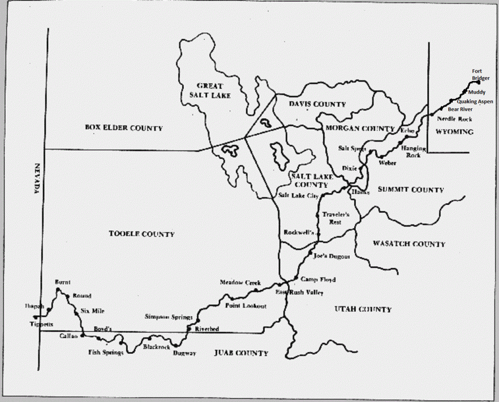 The most westerly station located within the present boundaries of Utah was the home of Howard Egan at Deep Creek Valley. He laid out the Overland Road and supervised its construction even before Simpson “surveyed” the route. As the largest station west of Camp Floyd, Egan’s ranch supplied several of the other stations with hay, grain, vegetables, meats and milk.