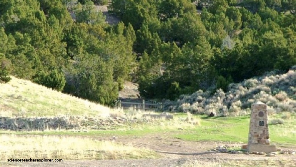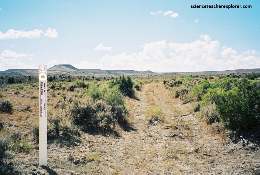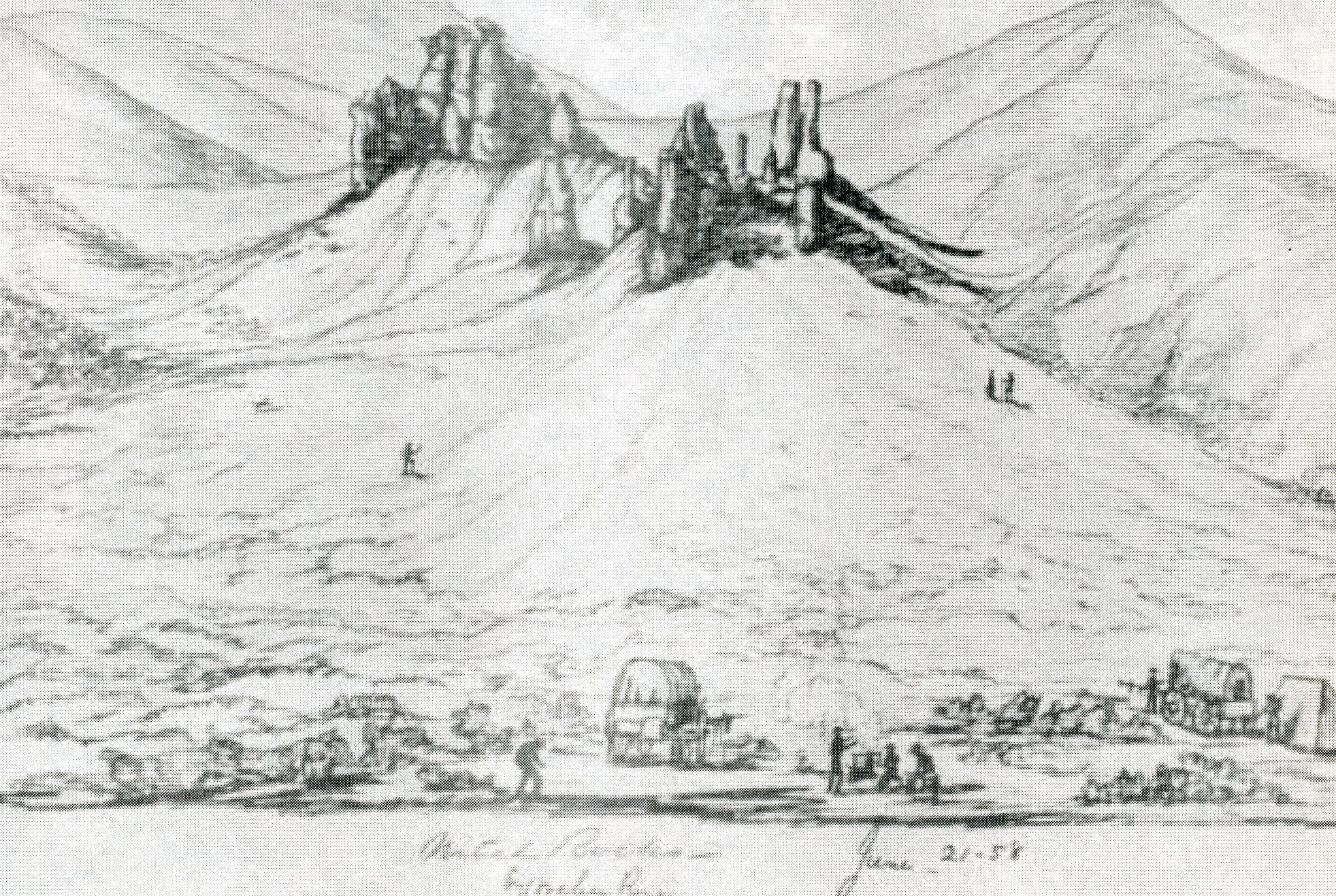 Pictured above, after fording the Bear River, the trail passed “The Needles” on the north side of the road. Needle Rocks Stage and Pony Express Station was not built until 1861.