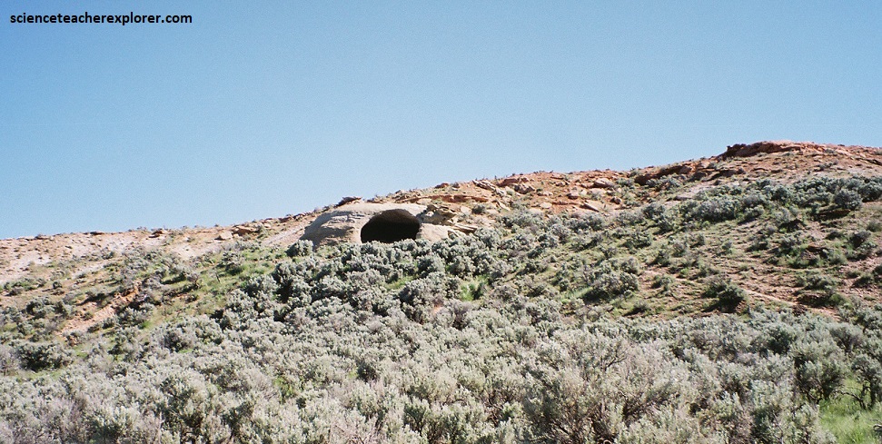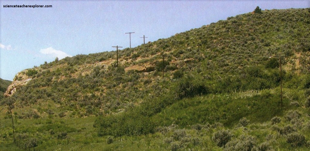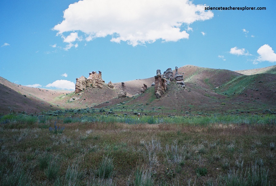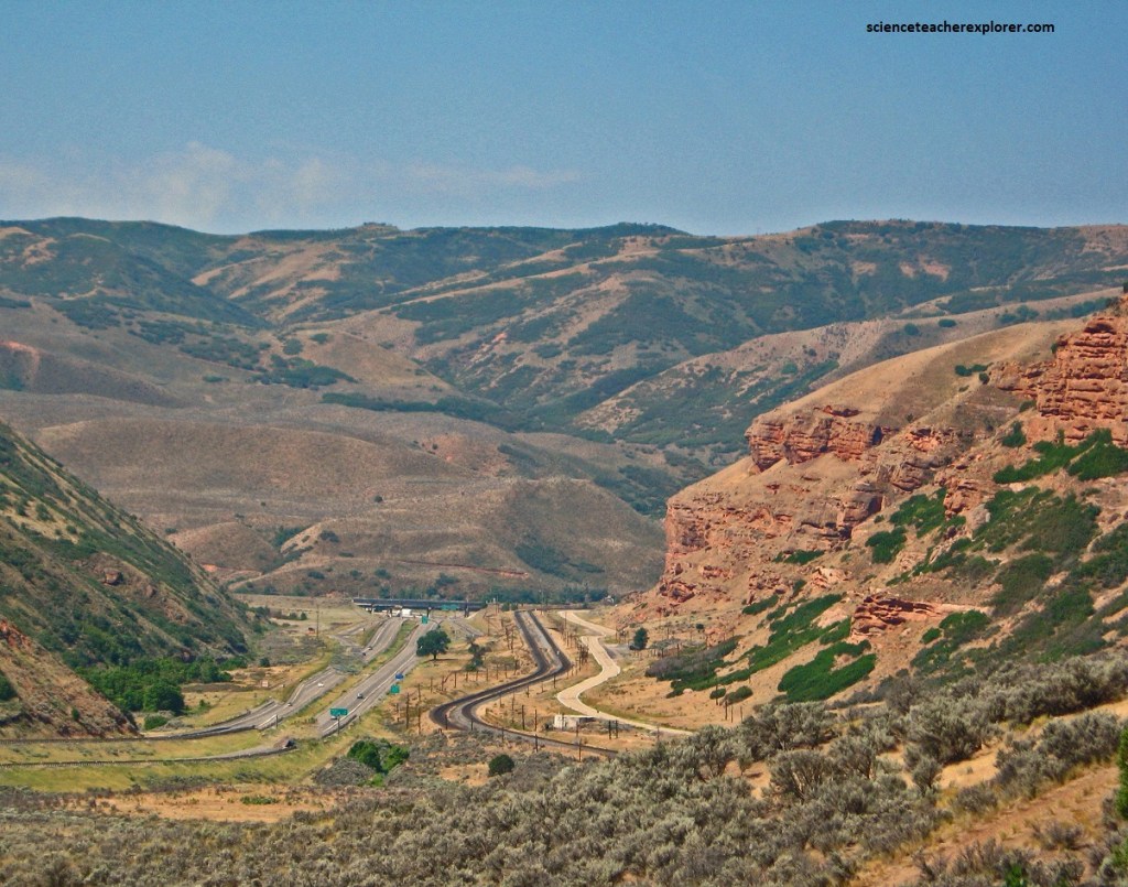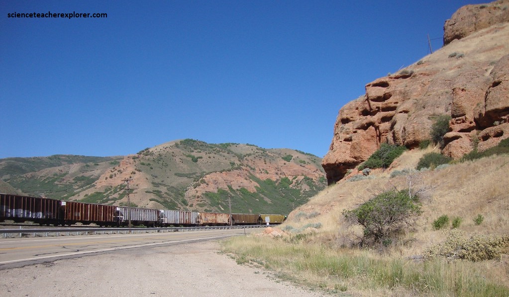 Just a few kilometers west of the Weber Station Site is the travelers historical landmark called “Witch Rocks”, (pictured above). Witch Rocks is a conglomerate of the Henefer Formation that was deposited about 90 to 85 million years ago when Sevier thrust faulting in Utah had reached its peak. The conglomerate is composed of sandstone and quartzite pebbles, cobbles, and boulders eroded from the mountainous areas to the west and northwest. Streams then carried these sediments off of the highlands, eventually depositing the heavier material in large alluvial fans (fan-shaped stream and debris-flow deposits). The elements have eroded areas of the conglomerate near Echo into the fantastic shapes seen in the above photo. The upper “caps,” or witches’ hats, are formed of a lighter-colored conglomerate layer cemented into a harder mass than the softer, underlying conglomerate layer that forms the witches’ “robes.” The harder cap rock erodes more slowly and helps protect the rock underneath.