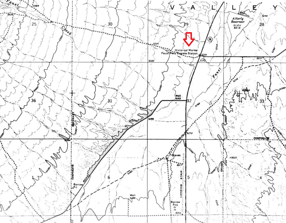 Henry Jacob “Doc” Faust served as the station-keeper for the Chorpenning’s line and then for the Pony Express. The station has been called Rush Valley, Bush Valley, Faust Station and Meadow Creek. It is believed that the station served as a home station. Faust also acted an an alternative rider when needed. The station house was a log structure with a low pitched roof and perhaps as many as seven rooms. Pictured above, the site was very littered in 2002 with the debris of extensive activity over the years.