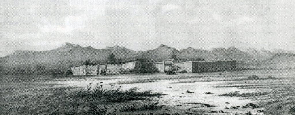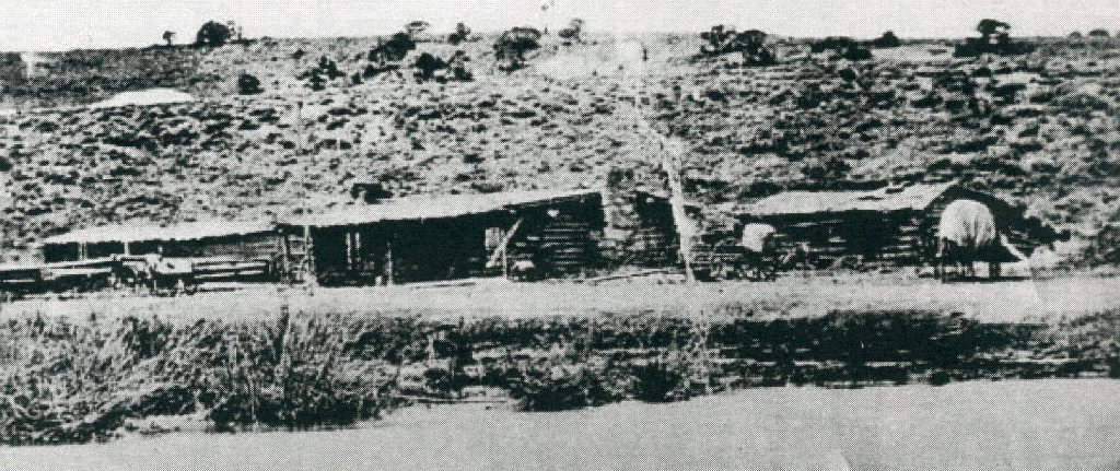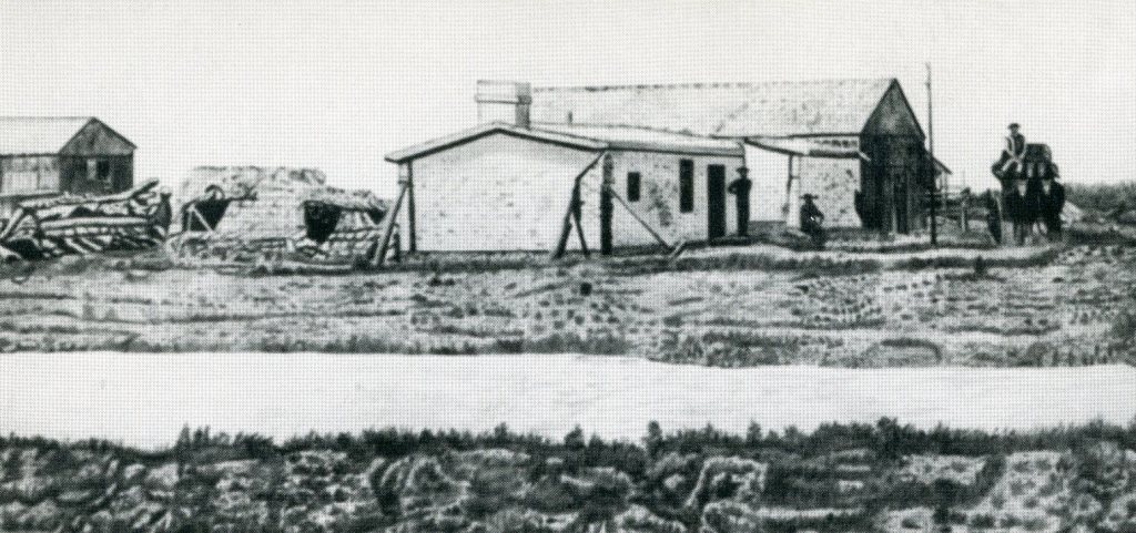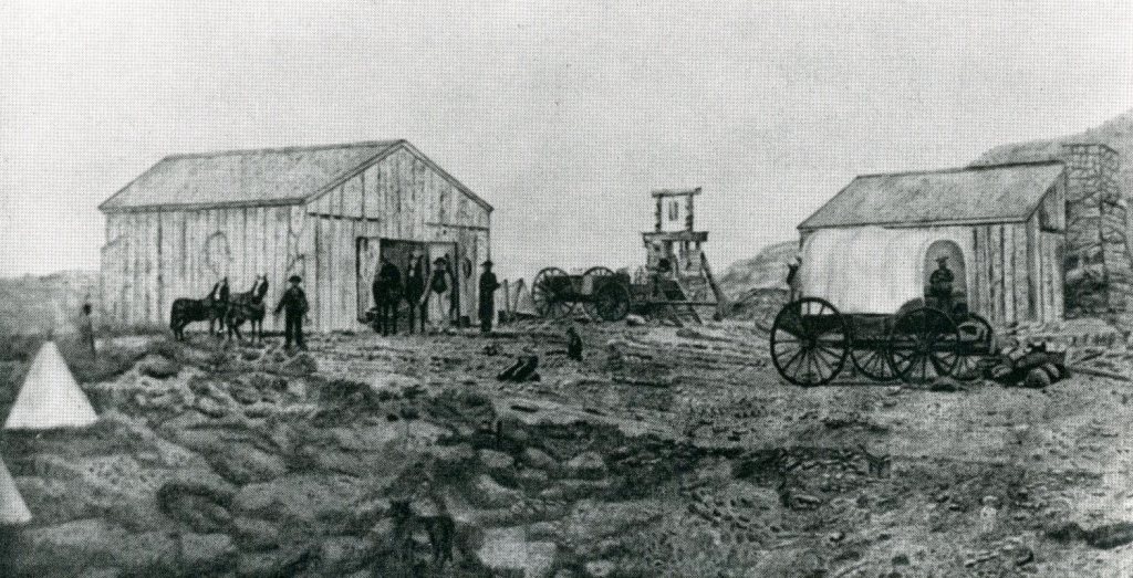 The famous explorer, Richard Burton riding the stage, describes the Deep Creek Station as “two huts and a station-house, a large and respectable-looking building of unburnt brick, surrounded by fenced fields, watercourses, and stacks of good adobe”.