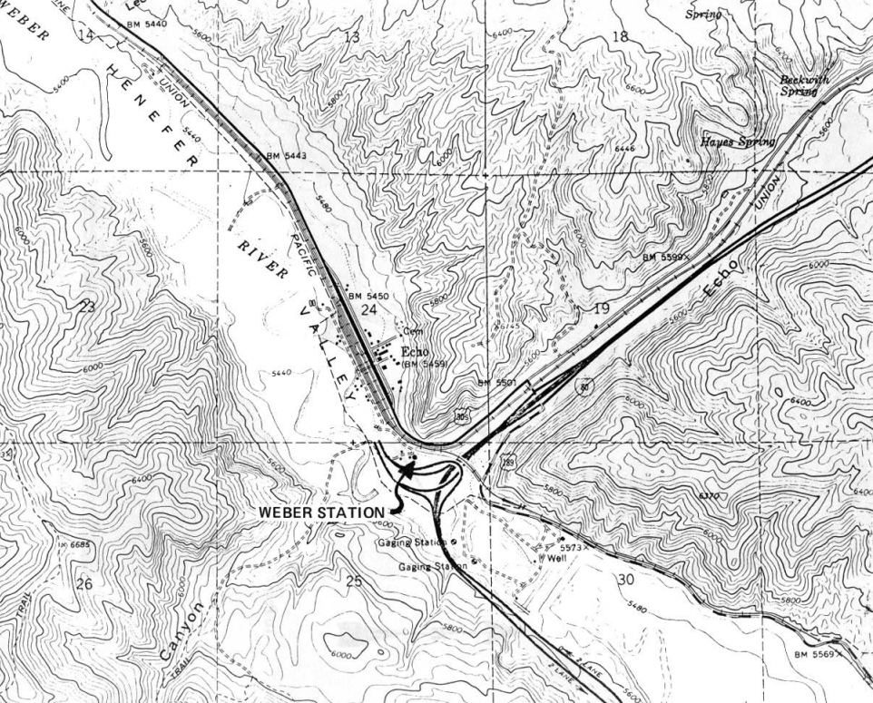 Pictured above, the area at the junction of Echo Creek with the Weber River has been subject to extensive grading, leveling and filling to make possible the junction of the Interstates. Matching the exact location of the historical site was difficult.