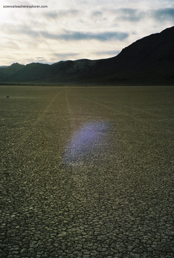 In December of 2006, the University of Utah Natural History Museum had me run an educational 4 day tour to Death Valley National Park. One of our side trips were to explore the mysterious location called the Racetrack. Nestled in a remote valley between the Cottonwood and Last Chance Ranges, the Racetrack is a place of stunning beauty. The Racetrack is a playa, (a dry lakebed), best known for its strange moving rocks. The road to Racetrack Valley begins near Ubehebe Crater. Normally, it is recommended for high-clearance vehicles with heavy-duty tires as it can be rough and washboard.
