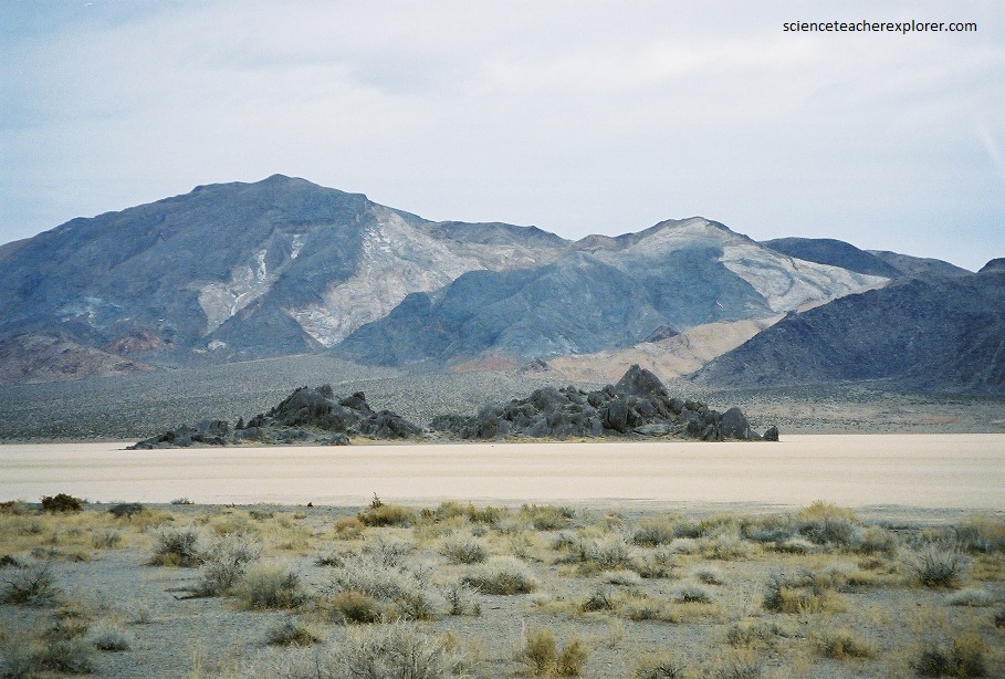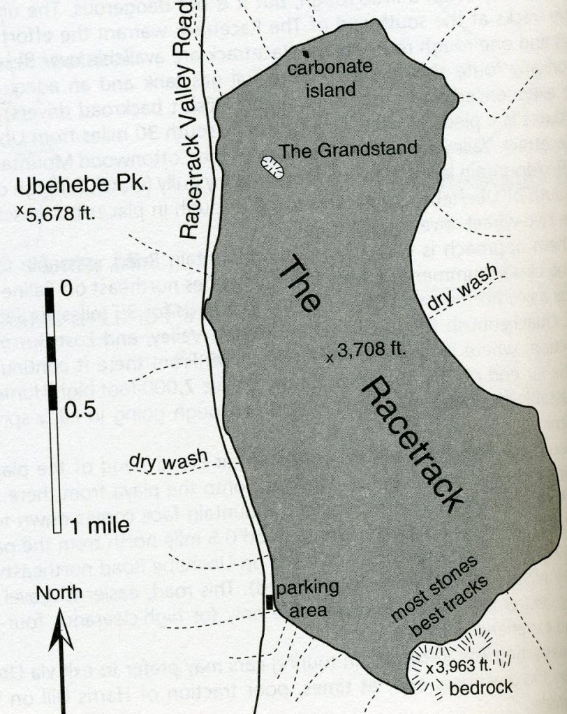 The playa’s name comes from its oval shape and the unusual bedrock islands near its north end, “The Grandstand” (24 m high), and smaller neighboring carbonate-rock knob, (pictured below). [These islands could be a grandstand and a judges’ stand]. The playa’s name also fits for the rocks that mysteriously sail across the playa surface when conditions are just right, leaving tracks that record their travels in the soft, wet mud.
