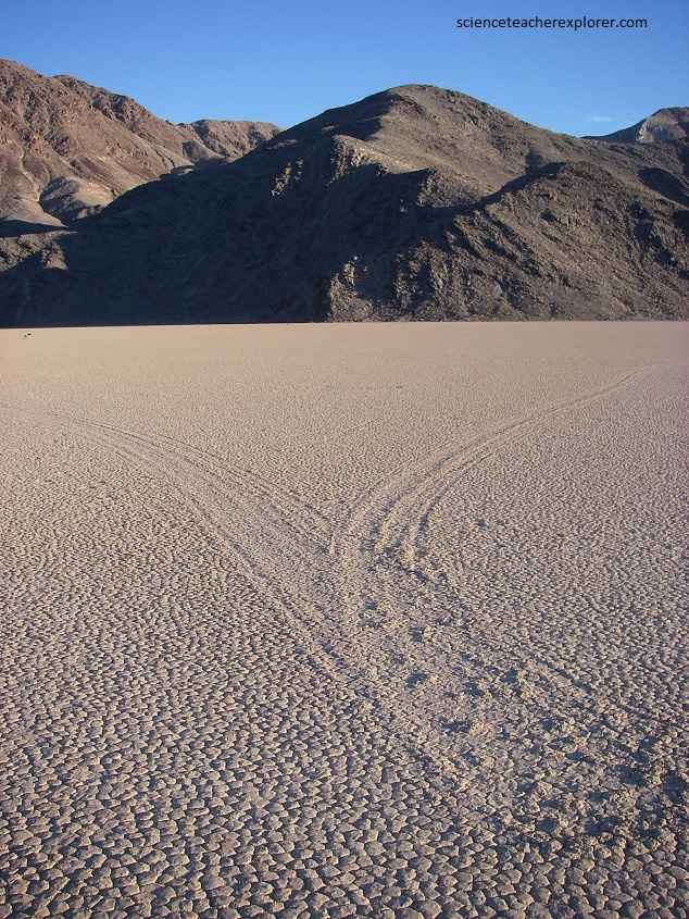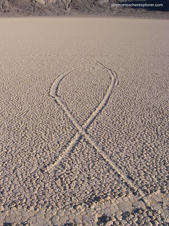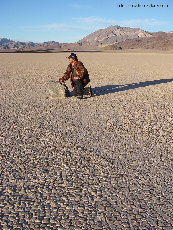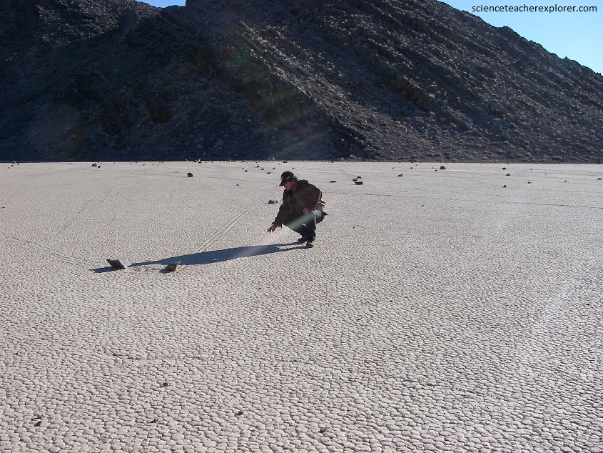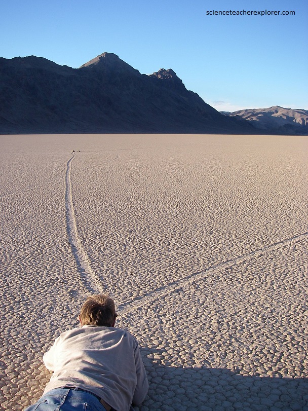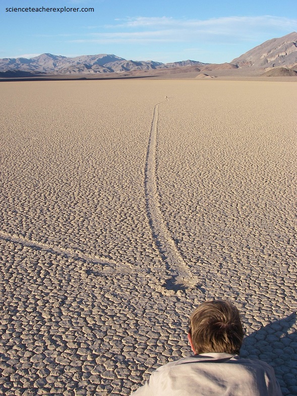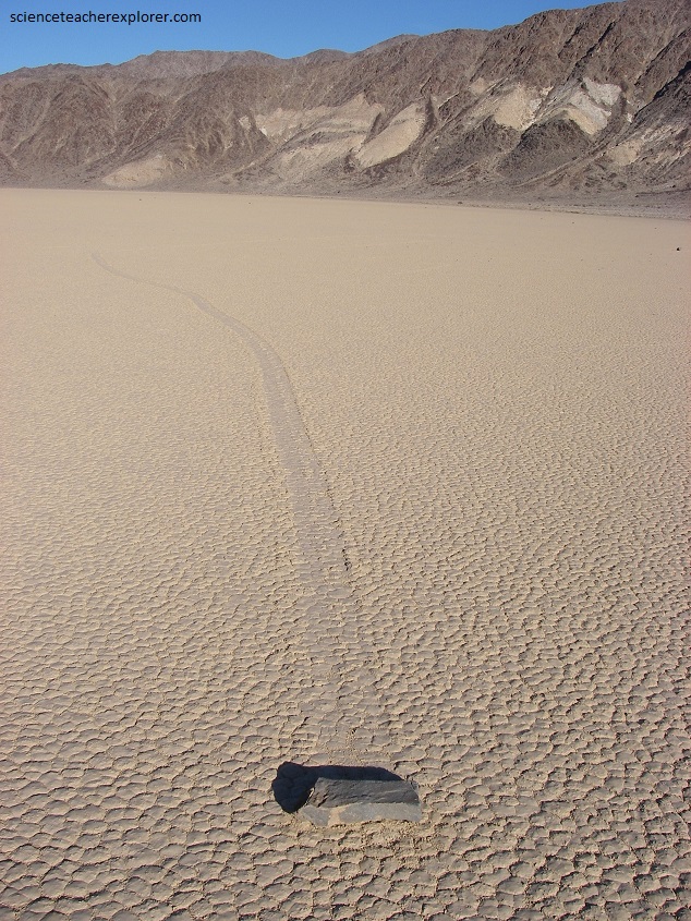 Over the years, people have proposed a variety of weird mechanisms for moving the stones, some just short of invoking little green men from outer space. Most trained investigators of the problem accept wind as the motivating force. Some researchers feel that wind alone cannot accomplish the task and that wind-driven sheets or floes of ice into which the stones are frozen are required, (pictured below).