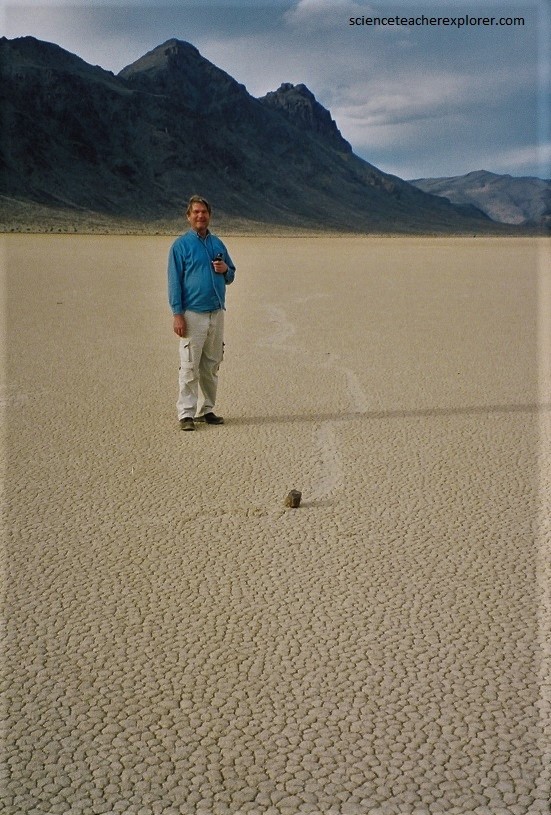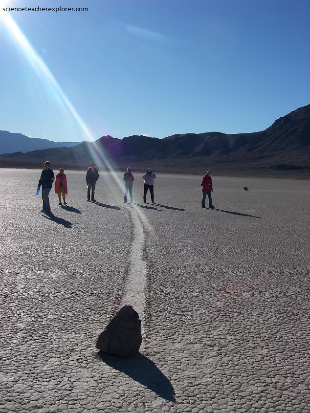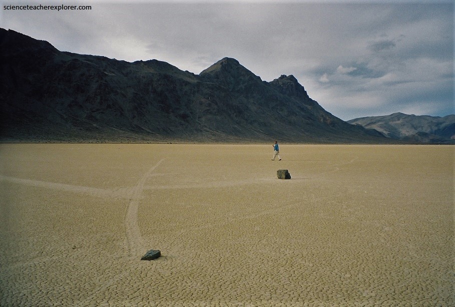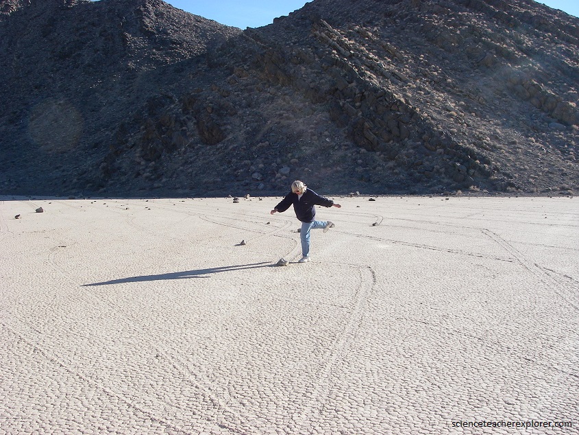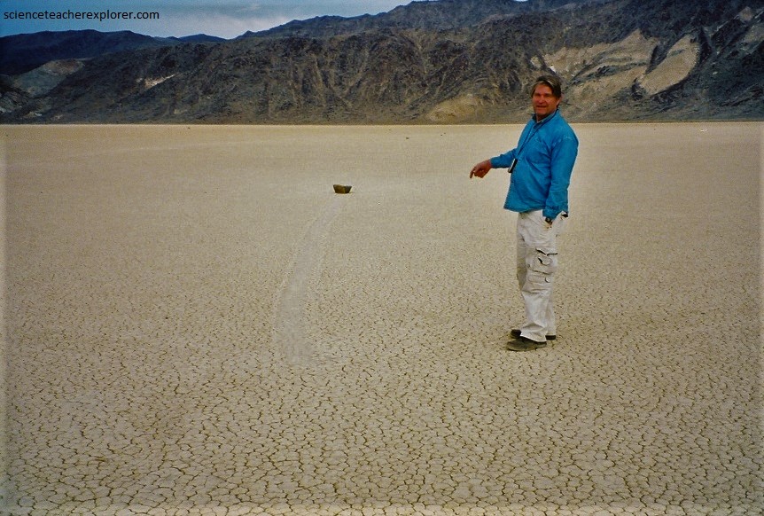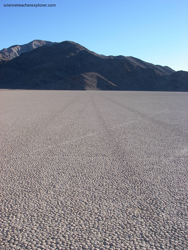 Over the years, people have proposed a variety of weird mechanisms for moving the stones, some just short of invoking little green men from outer space. Most trained investigators of the problem accept wind as the motivating force. Some researchers feel that wind alone cannot accomplish the task and that wind-driven sheets or floes of ice into which the stones are frozen are required, (pictured below).