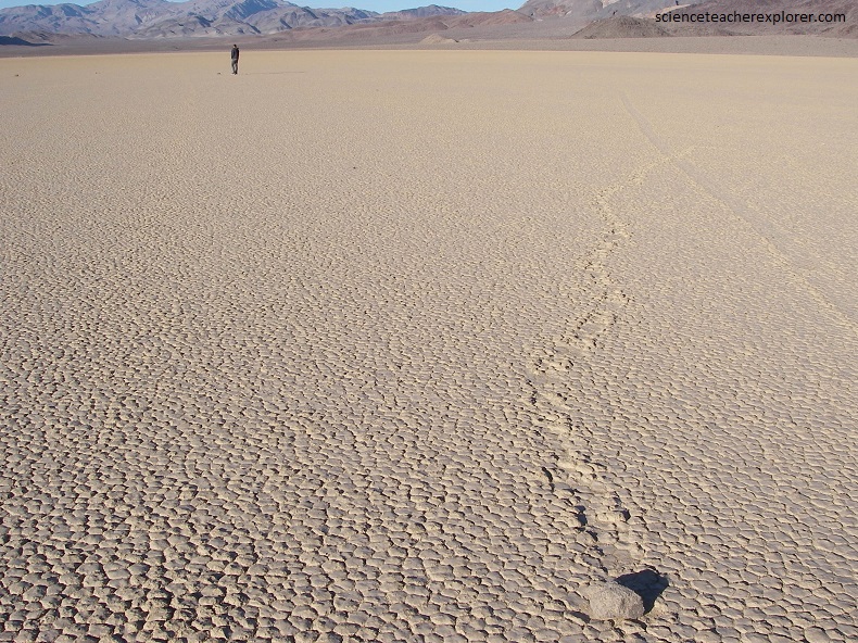 Pictured below, stones move across the playa surface, leaving distinct tracks in the wet mud tens to hundreds of meters long, a few centimeters or 30 or more centimeters wide, and a couple of centimeters deep. The longest continuous track we could find during our visit was 660 meters.