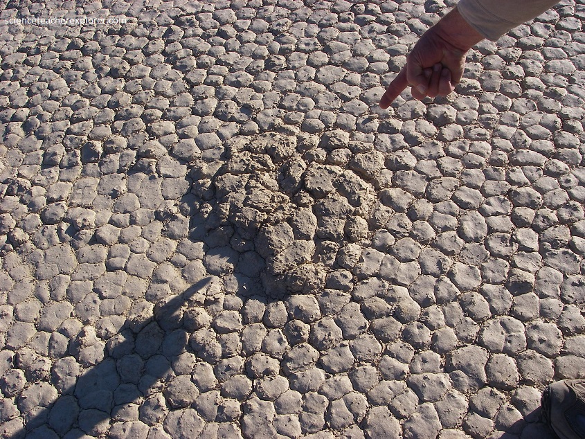 Pictured above, mud cracks cover most of the Racetrack’s surface. The mud cracks are old, semi-permanent features outlining polygons 5-10 cm in diameter and about 3 cm deep. They form as the playa’s mud surface dries and shrinks, radiating from regularly spaced centers, usually in sets of three crack at 120 degrees to each other. The cracks intersect with other cracks from other centers to form polygons. Polygons on The Racetrack are mostly irregular shapes.
