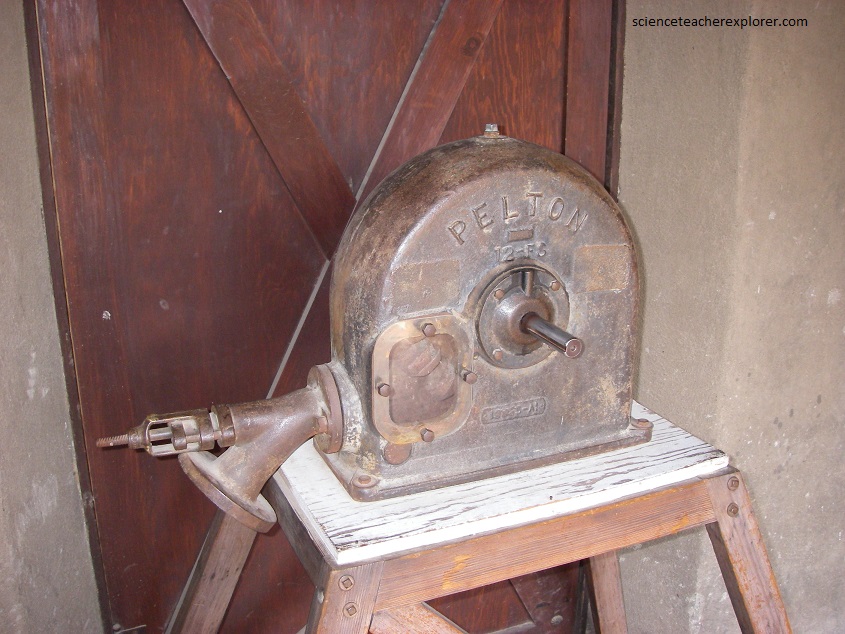 What amazes me is the small amount of water that causes the “Pelton” generator to work. Pictured below, nozzles direct forceful, high-speed streams of water against a series of spoon-shaped buckets, also known as impulse blades, which are mounted around the outer rim of a drive wheel. As the water jet hits the blades, the direction of water velocity is changed to follow the contours of the blades. The impulse energy of the water jet exerts torque on the bucket-and-wheel system, spinning the wheel; the water jet does a “u-turn” and exits at the outer sides of the bucket, decelerated to a low velocity. In the process, the water jet’s momentum is transferred to the wheel and hence to a turbine. Thus, “impulse” energy does work on the turbine to create electricity.