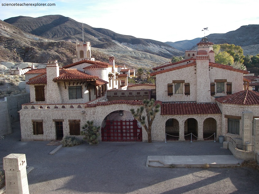 Scotty’s Castle is named for gold prospector Walter E. Scott, although Scott never owned it, nor is it an actual castle. Scott found an investor and convinced a Chicago millionaire named Albert Mussey Johnson to invest in Scott’s gold mine in the Death Valley area. Though initially angered when the mine turned out to be fraudulent, Johnson was fascinated with the colorful Scott and the two men struck up an unlikely friendship. By 1937, Johnson had acquired more than 1,500 acres in Grapevine Canyon, where the ranch is located. The Johnson’s hired an architect and built the house seen above. Later they sold it to Death Valley National Park.