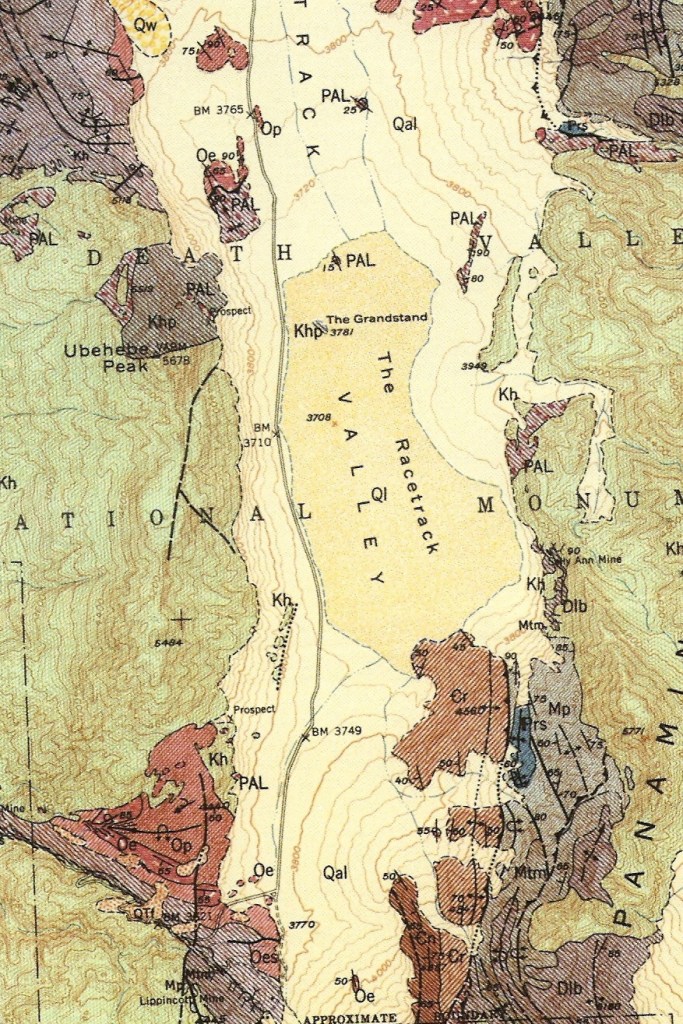 The Racetrack Playa is a dry lakebed that sits at an elevation of 1240 meters in Racetrack Valley, between two north prongs of the Panamint Range. Ubehebe Peak, at 1893 meters, looms just 1.4 km west. The playa measures 4.5 km north to south and up to 2.1 km east to west. The lakebed is extremely flat, firm, and vegetation-free. A surveyed leveler shows the north end is 3.8 cm higher than the south end.