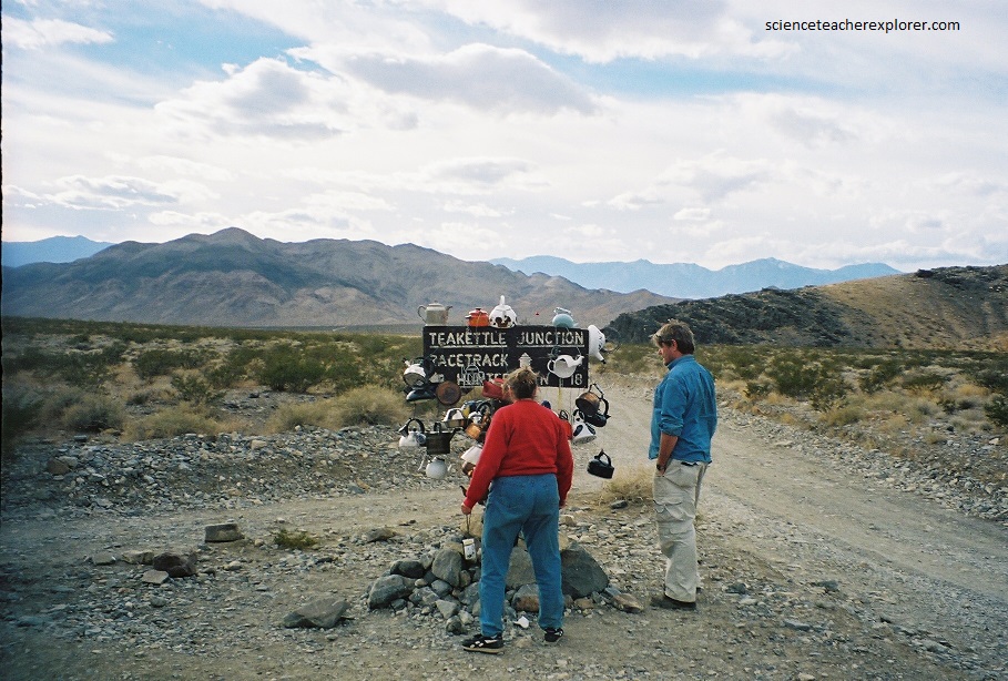 Once we left Ubehebe Crater and drove on a graveled 4WD road for 32 km, we reached Teakettle Junction, (pictured below). According to the locals, it is said to show early settlers that there was water nearby. The tradition is to bring a new teakettle and to either inscribe your message on it or to write a letter and put it in it. This is said to bring good luck to those that leave a kettle and to provide an exciting sign for future travelers.