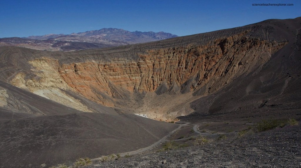 Only a few thousand years ago, great explosive eruptions blasted out this 1 kilometer wide, 200 meter deep crater, (pictured below). Molten rock rose along fractures and mixed with ground water in the alluvial fan deposits. The superheated water flashed to steam and blew out both the fan rocks and volcanic fragments called cinders. Pictured below, Ubehebe Crater is 106 km north of Furnace Creek Visitor’s Center. At the crater wall you can see the older fan deposits that are light in color in contrast to the darker beds of cinders that were dumped on top. The sudden change in color of the rocks about 50 meter below the rim marks the transition. Cinders were scattered over 16 square kilometers around the crater by the violent explosions, and for the dark gray soil that is now sparsely dotted with desert holly bushes.