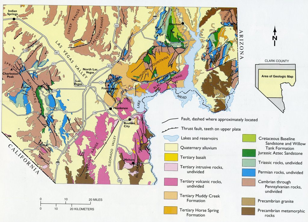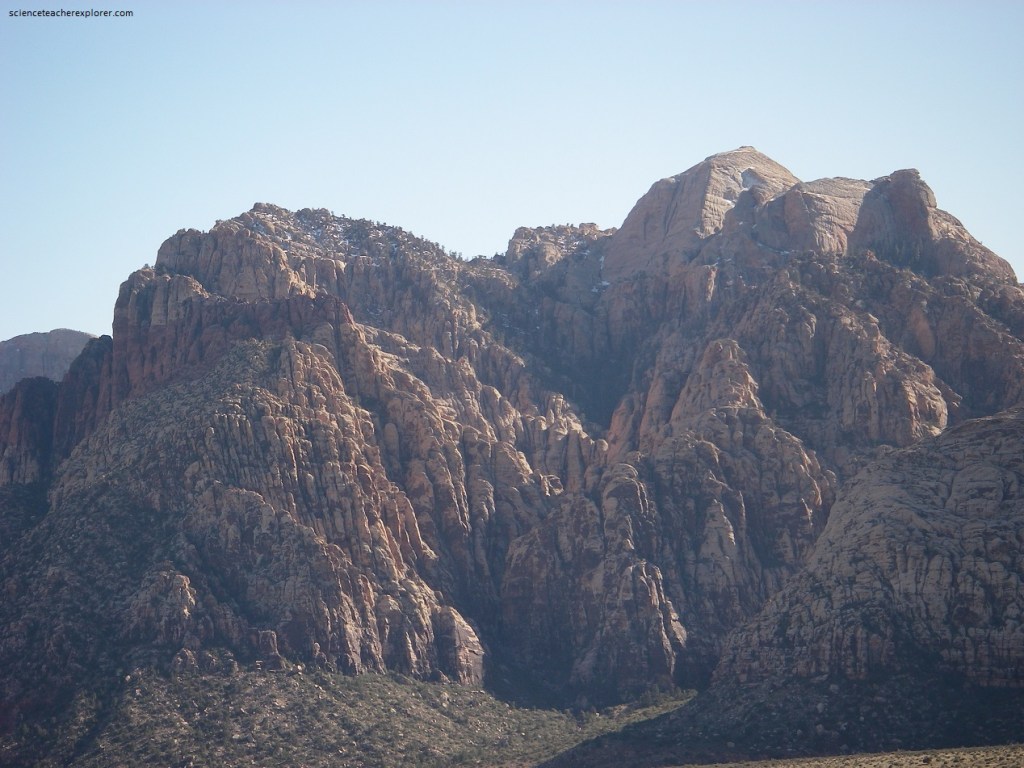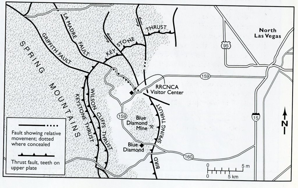 During a mountain-building period of the Cretaceous Period, called the Laramide orogeny, around 66 million years ago, the Keystone Thrust Fault System developed. The Keystone & companion “Wilson” is part of a series of thrust faults which ran through much the Red Rock Conservation Area. The movement of this fault forced the older gray Cambrian sedimentary-rock over the younger red Jurassic sedimentary-rocks, forming the varicolored landscape that can be seen in the mountain today. The thrust is exposed over a distance of 21 km along the Red Rock escarpment.