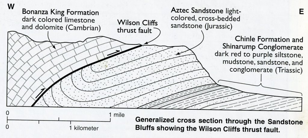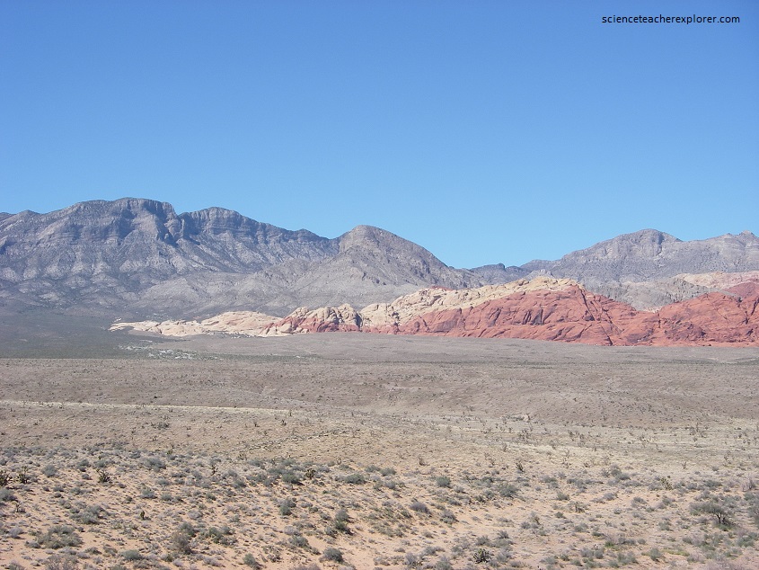 Pictured below, a good view of the Wilson Cliffs thrust. The grey rocks on the horizon are Bonanza King limestones that form the upper plate of the thrust. The red and white Aztec Sandstone is in the lower plate. The thrust contact is to the left, behind the Red Rock escarpment. The contact then swings around to the north and crosses the valley, behind the two points of red rock.