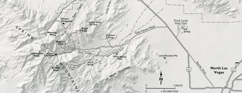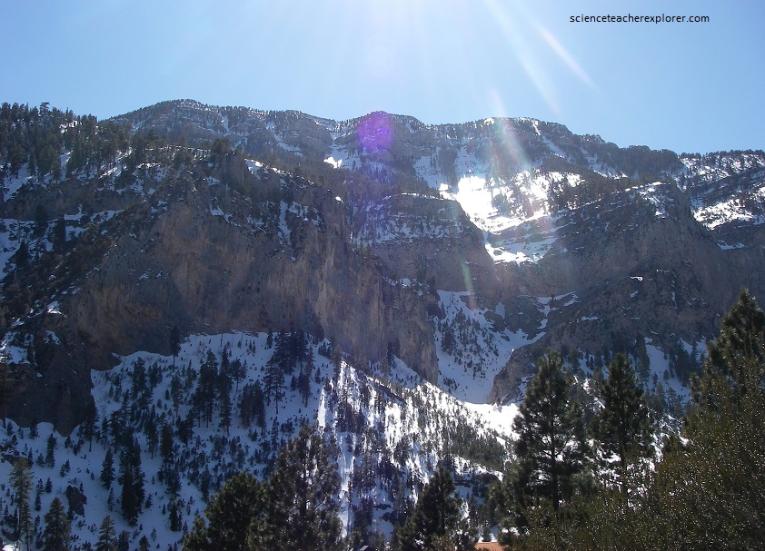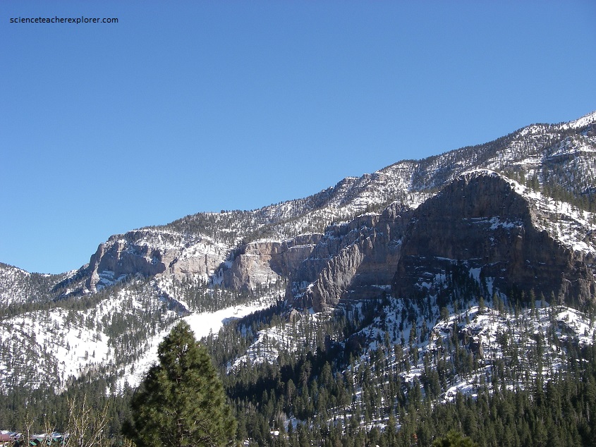 Pictured above and below, the prominent cliffs of Kyle Canyon are composed of Devonian and Mississippian dolomite and limestone situated in the upper plate of one of the regional thrust faults. At this location, these older rocks are thrust over Bird Spring Formation, (most of the tree and shrub covered slopes on both sides of the highway are underlain by Bird Spring Formation).