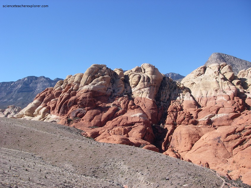 Pictured above, the Aztec Sandstone Formation is actually present throughtout much of the southwestern United States. In Zion National Park of Utah, this rock layer is called the Navajo Sandstone. In the northern parts of Colorado and Utah, it is called the Nugget Formation. The Nevada outcrops of Atec Sandstone represent the westernmost extension of this widespread rock unit. I addition to the spectacular cliff-face exposures that you in the above photo, you will see more Aztec Sandstone in the “Valley of Fire National Monument”.