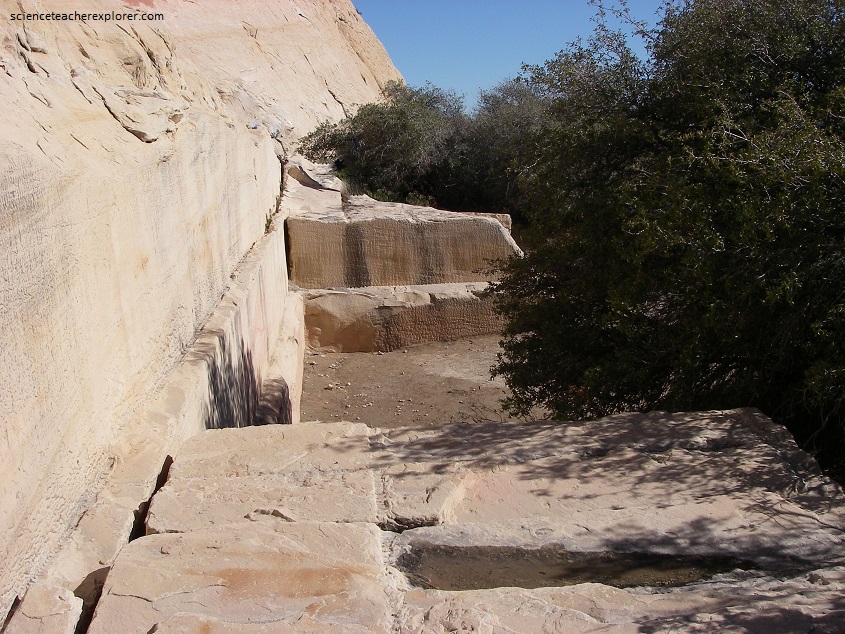 Picture below, one of the first industries established in the Las Vegas area after 1905 was this quarry, which produced very hard, (due to the presence of calcite or quartz cement between the sand grains), red and white sandstone for buildings in Las Vegas, Los Angeles, and San Francisco. A huge steam traction engine hauled the cut blacks to the railroad in Las Vegas. The quarry closed in 1912 due to competition from a new quarry closer to the railroad.