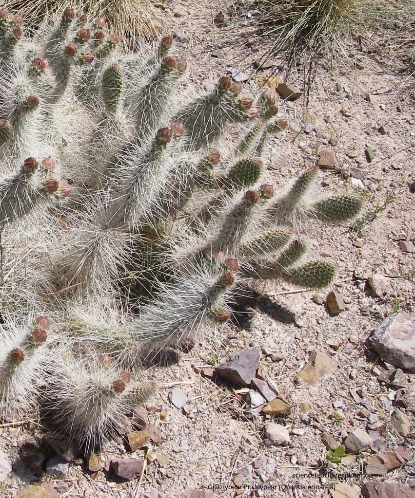 Pictured above, this Grizzlybear Pricklypear cactus forms small, low clumps with erect branches. The pads are thickly covered with long, gray, downward-pointing spines. Flower color varies from rose to yellow depending on variety and the fruit is dry and spiny.