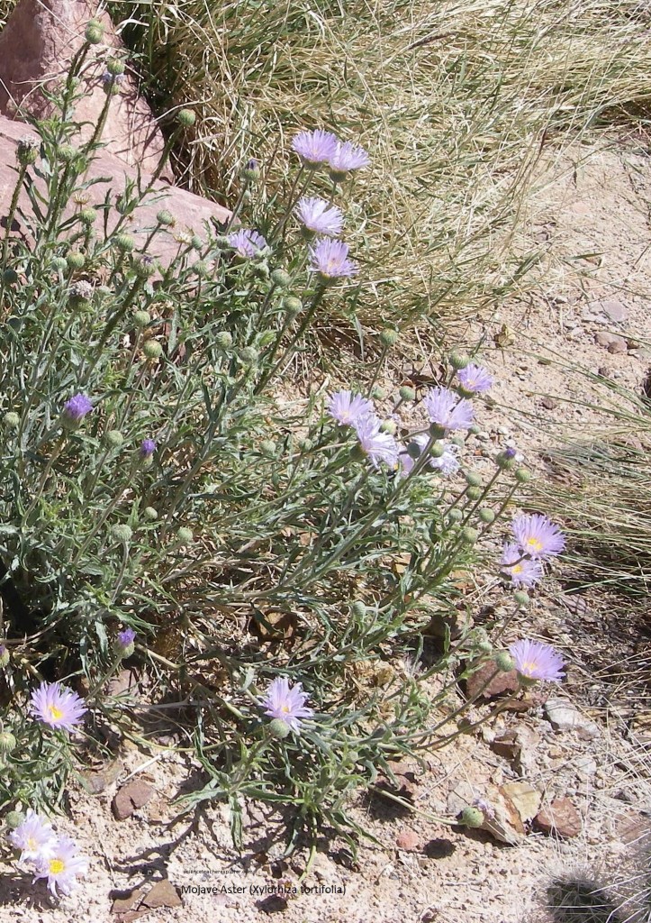 Pictured above, this member of the Sunflower Family is a shrubby perennial growing up to 76 cm high. The Mojave Aster contains many long, gray-green stems with lanceolate, hairy, 7 cm leaves growing from the base. The stems tend to remain leafless near the top. Each plant may bear as many as 20 flowers.