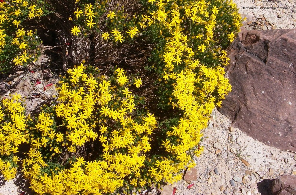 Pictured above, from April to September damianita is covered with a profusion of bright, golden-yellow flowers. A small evergreen shrub with dark green, highly aromatic needle-like leaves, it grows on rocky limestone soils and is extremely heat and drought tolerant.