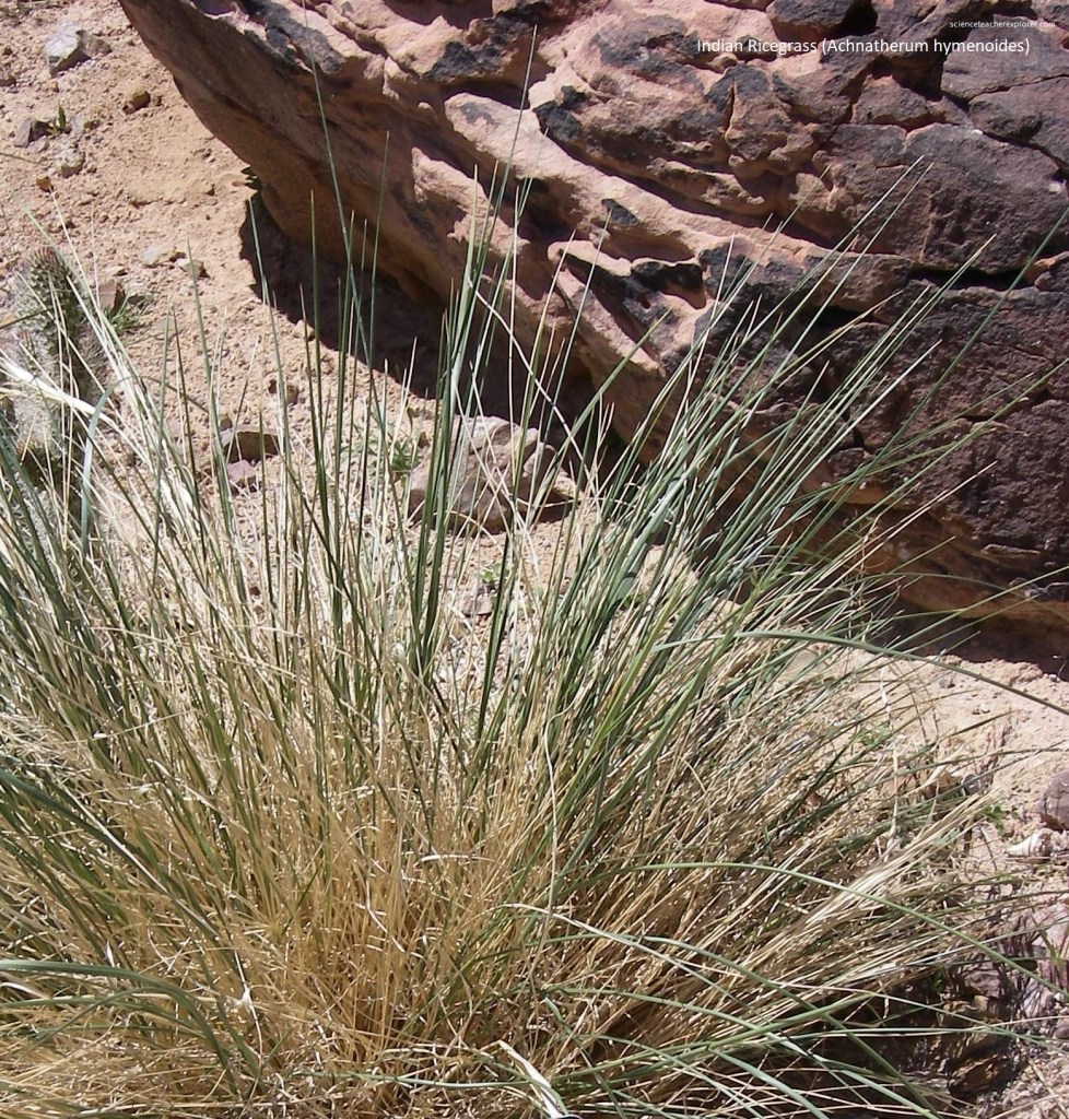 Pictured above, Indian rice grass is a 6 cm tall, perennial bunchgrass. The sage-green, wiry foliage and ivory-colored seed-heads give the grass an overall light, airy appearance. Foliage turns tan when dormant. This beautiful grass often dominates sand dunes. It is a highly palatable species for many animals including livestock.