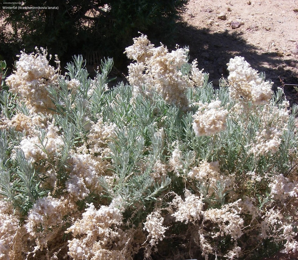 Pictured above, Winterfat is a low-growing, long-lived (up to 130 yrs old) subshrub with a woody base and numerous annual branchlets, growing 1 to 90 cm tall. Herbage is hairy giving the plant a silvery white appearance. It flowers April to September and reproduces from seed and sprouting. Sprouting of the buds near the plants base occurs when the plant is browsed or damaged.