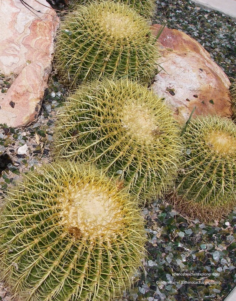 Pictured above, the golden barrel cactus has a globe-like appearance and is recognized by its magnificent color that comes from vertical yellow ribs that line its edges. The golden barrel is considered a rare and endangered species. It grows slowly to three 90 cm and spreads 60 cm wide. At maturity, yellow blossoms appear at the top of the plant in spring, followed by fruit.