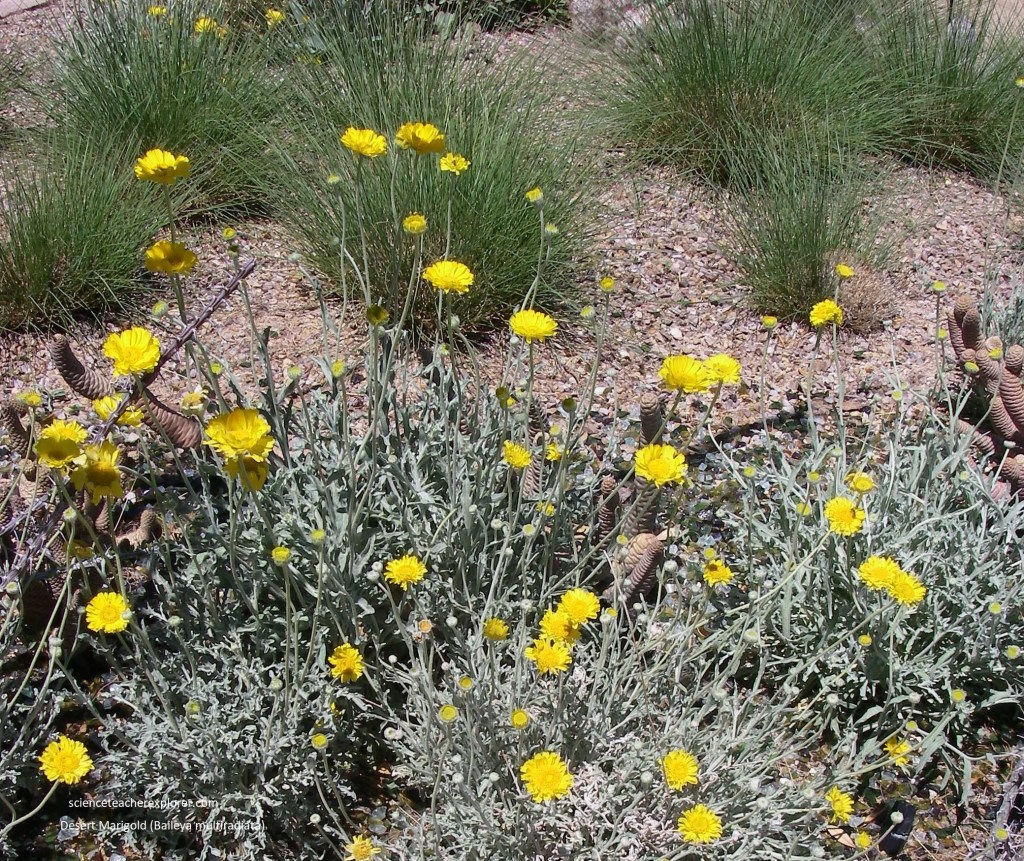 Picture above, the Desert marigold are characterized by individual florets arranged in dense heads making the floret group look like one single flower. On the marigold the clusters form a head 5 cm in diameter and are bright yellow in color. The leaves are green with silver-white hairs, lobed, and grow very low on the thick stems.