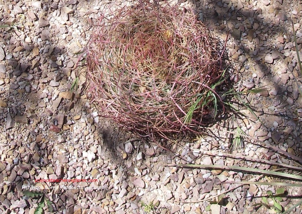 Pictured above, the fishhook barrel cactus can be identified by its thick (60 cm), barrel shaped body and long hooked spines. Fishhook barrel cactus grow along desert washes and gravelly bajadas. It is less likely to occur on valley floors or rocky slopes. This cactus does contain water, but the water contains oxalic acid and is likely to cause diarrhea if ingested when the stomach is empty.