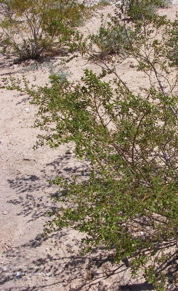 Pictured above, the Creosote bush is the most characteristic feature of North America’s hot deserts. It is one of the best examples of a plant that tolerates arid conditions simply by its toughness. It competes aggressively with other plants for water, and usually wins, accounting for its prevalence in many arid locations of the southwest. This medium-to-large evergreen shrub has numerous flexible stems projecting at an angle from its base. It is usually less than 1 meter high, but can grow to 30 cm heights with abundant water. Its small (2 cm), pointed, yellow-green leaves have adapted to conserve water and dissipate heat.