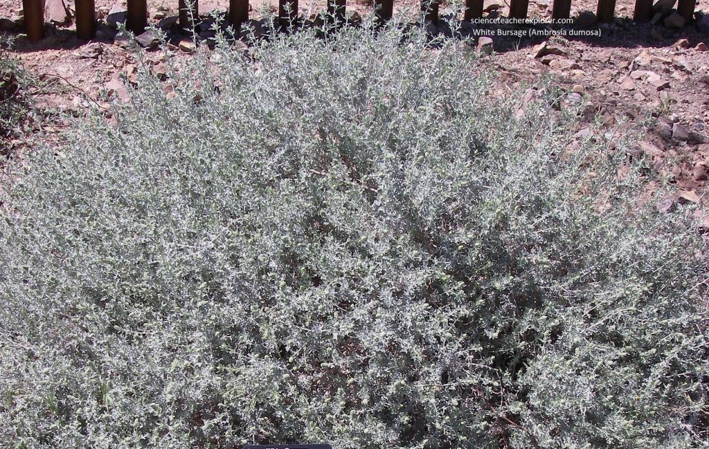Pictured above, White Bursage is a short, rounded shrub that often looks like a low mound of white, lifeless twigs. In the spring, however, it puts on a dense covering of short, lobed leaves and inconspicuous flowers. The flowers are green and spike-like, and the fruits are spiny.