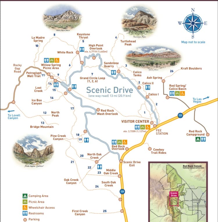 Becky (my wife) and I went on vacation in Las Vegas, Nevada during the Spring-break of 2006. While visiting there, we decided to explore the Red Rock Canyon National Conservation Area 24 km west of the Strip in Las Vegas, (easily seen from the Strip). A one-way loop road, 21 km long, provides vehicle access to many of the features in the area, (imaged below).
