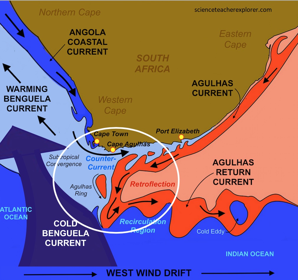 Cape Agulhas has one other important point of interest: modern hydrographers have determined at this is where the Atlantic and Indian oceans meet and is the southern most point in Africa. Here, the warm Agulhas Current that flows south along the east coast of Africa retroflects back into the Indian Ocean, (imaged above). While retroflecting, it pinches off large ocean eddies (Agulhas rings) that drift into the South Atlantic Ocean and take enormous amounts of heat and salt into the neighboring ocean. This mechanism constitutes one of the key elements in the global conveyor belt circulation of heat and salt.