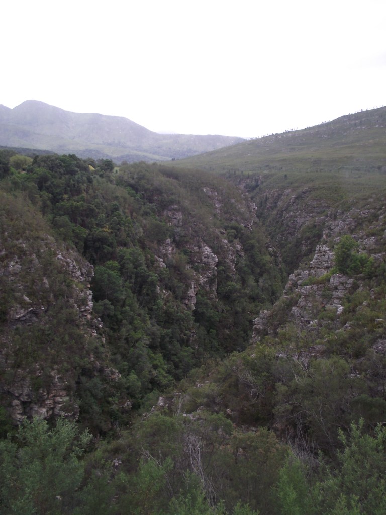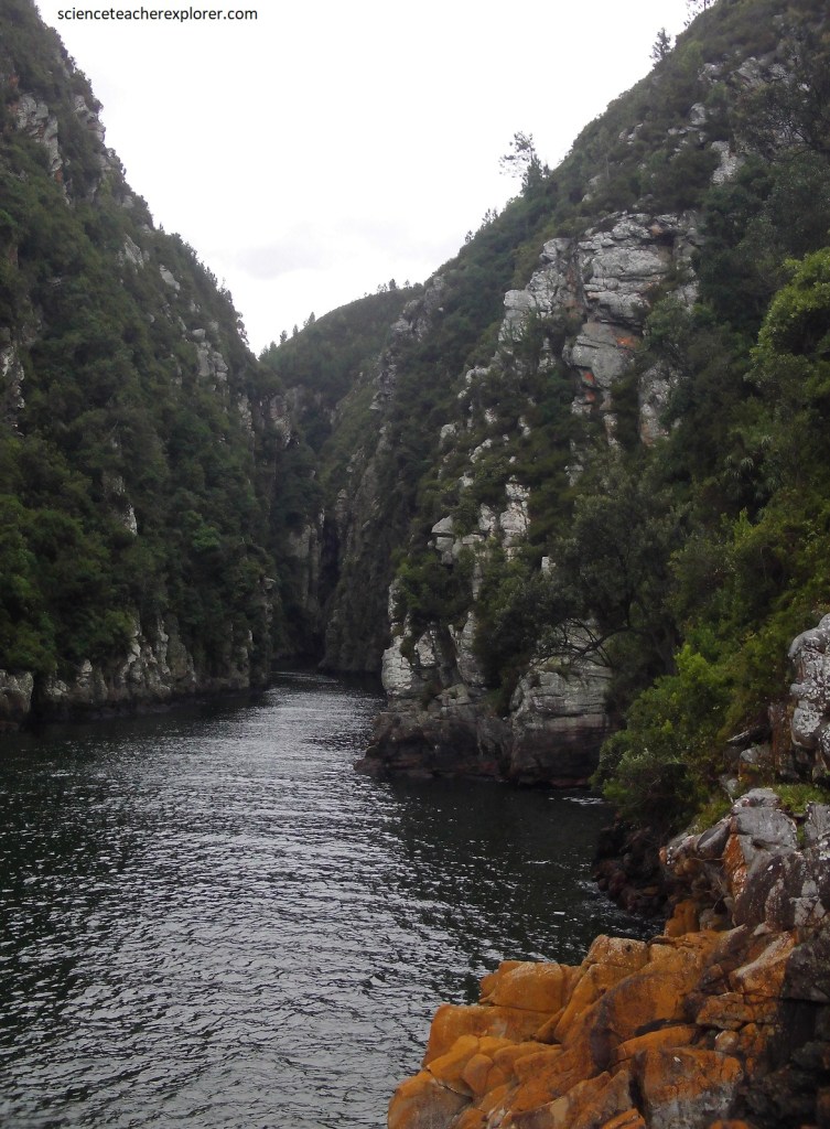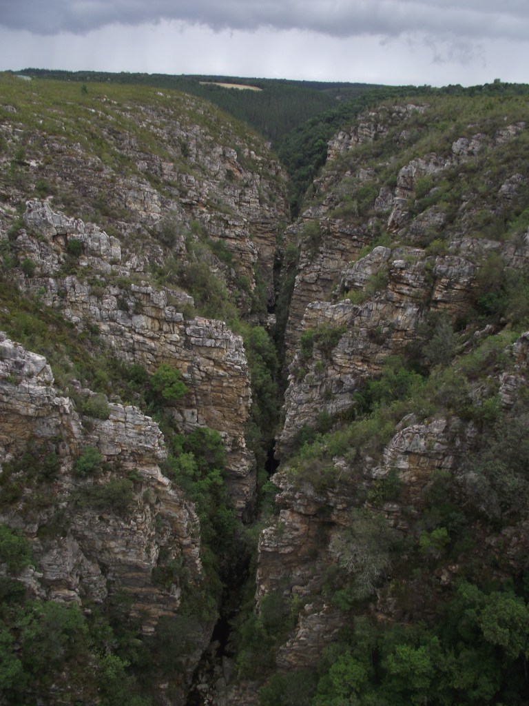 Pictured below, Storms River Gorge, as one looks south, is about 120 m deep and less than 10 m wide, seen from the bridge on the N2. Notice the flat coastal plain in the background.