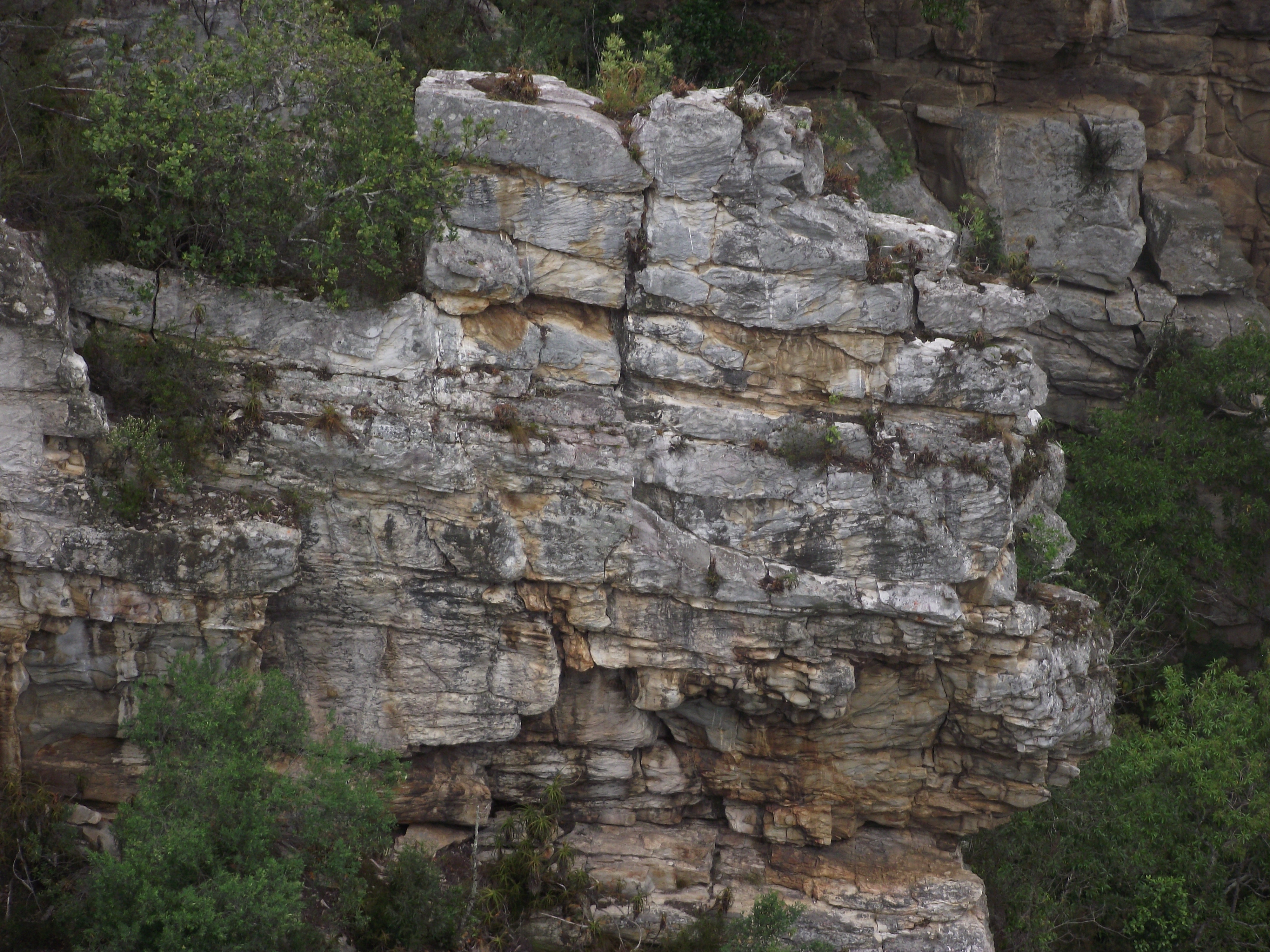 Pictured above, a bush-covered cleft in the hillside adjacent to the suspension bridge marks the positions of the Cederberg shale unit separating the Peninsula and Nardouw quartzites.