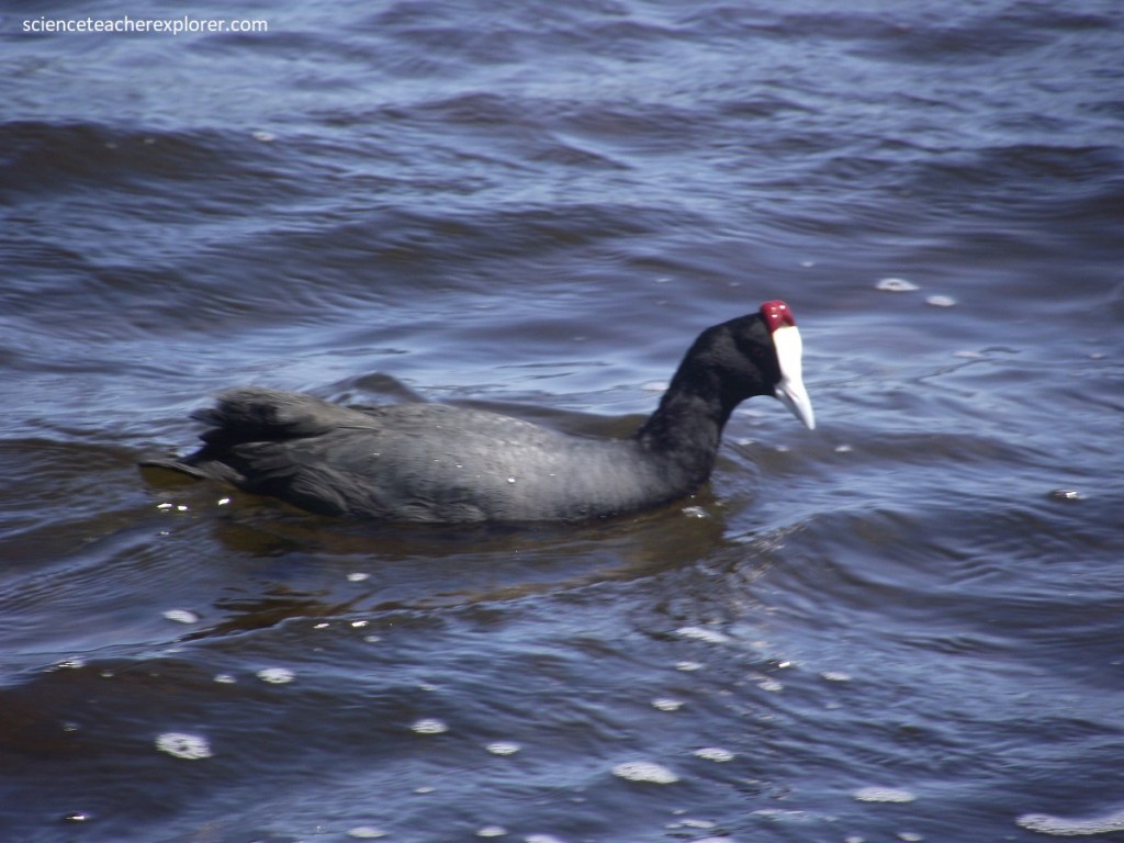 Pictured above, Red-knobbed Coot Fulica cristata was a fairly large black bird with a white bill and frontal shield. Above the shield are 2 red knobs. I understand that these become enlarged and brighter when the bird is breeding. I did notice the eyes were red also.